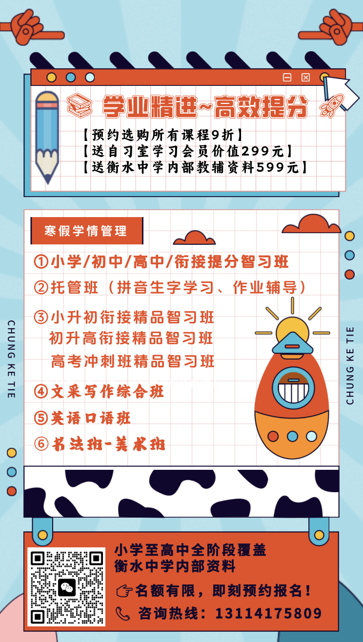 地址:衡水中学丘北教辅点,金色荷塘三楼。